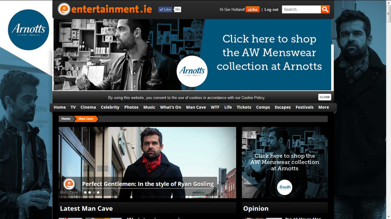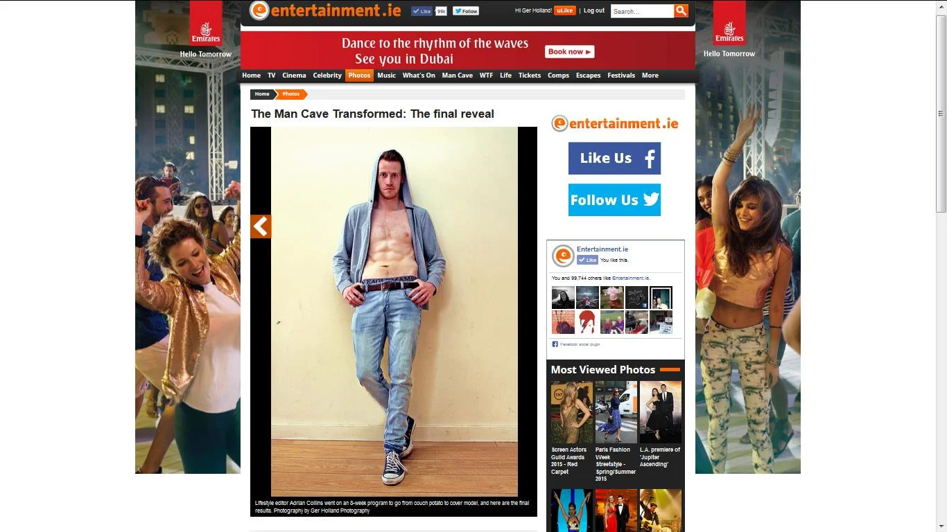 Three of my pictures feature on the two side margins and top border of the "Man Cave" section of entertainment.ie as part of a photoshoot I did of their Senior Editor, Mike Sheridan in Arnotts Department Store, Dublin.