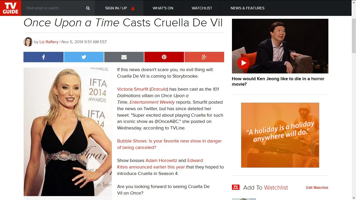 A picture I took of actress Victoria Smurfit appears in America's TV Guide. [November 5, 2014]